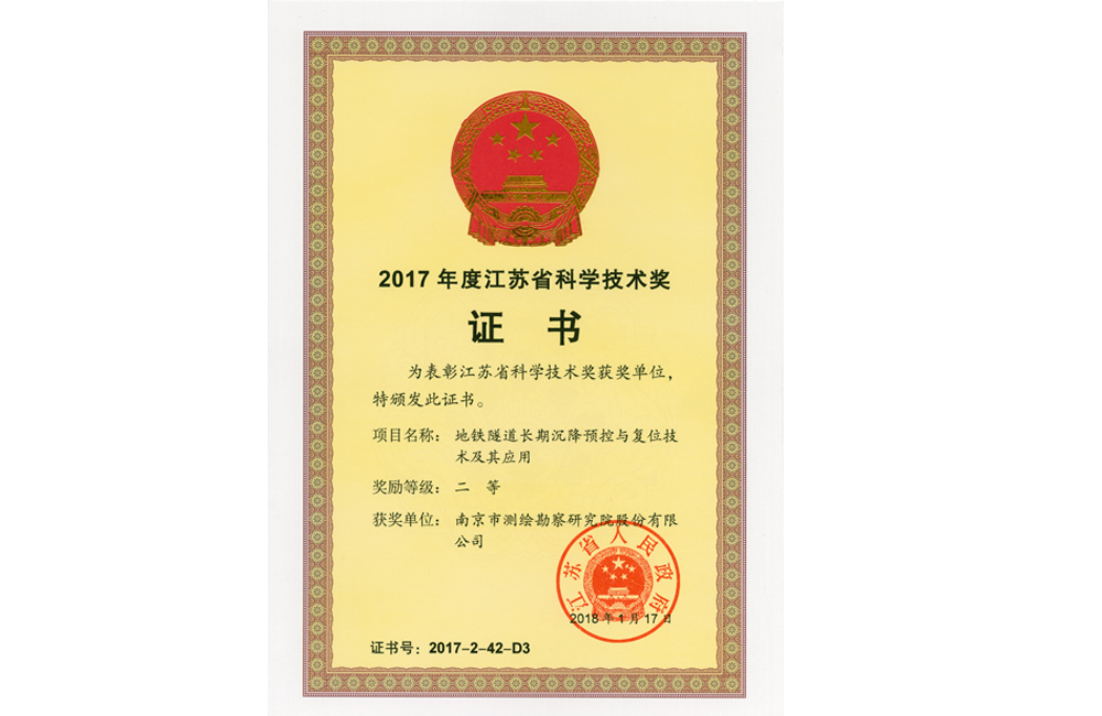 2017年度江蘇省科學技術(shù)二等獎——地鐵隧道長期沉降預控與復位技術(shù)及其應用